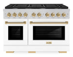 Luxury isn't meant to be desired - it's meant to be attainable. The ZLINE Autograph Edition 48 in. 6.7 cu. ft. Paramount Double Oven Dual Fuel Range with 8 Burner Gas Cooktop in Stainless Steel with White Matte Doors and Polished Gold Accents (SDRZ-WM-48-G)) combines the versatility of a gas cooktop with 8 Italian-made auto-reignition burners, a large high-performing electric convection oven and a small bake-and-broil oven with digital thermostat technology, enhanced cast iron grates, beautiful white matte doors with Horizon window designs, and elegant polished gold knobs and handles allowing you to master every meal. With a modern, timeless style and refined functionality, ZLINE Paramount Dual Fuel Ranges are masterfully crafted to deliver an elevated culinary experience.