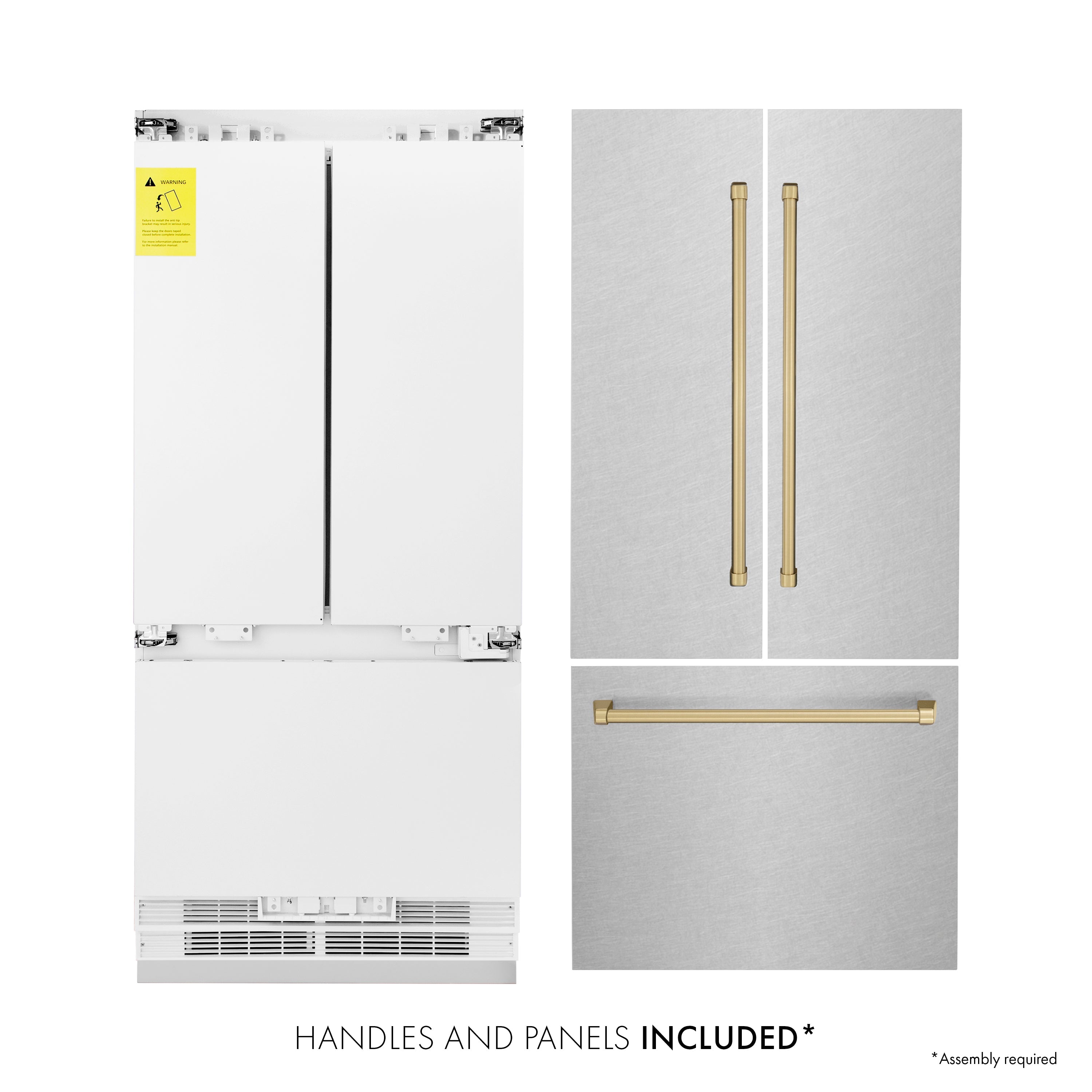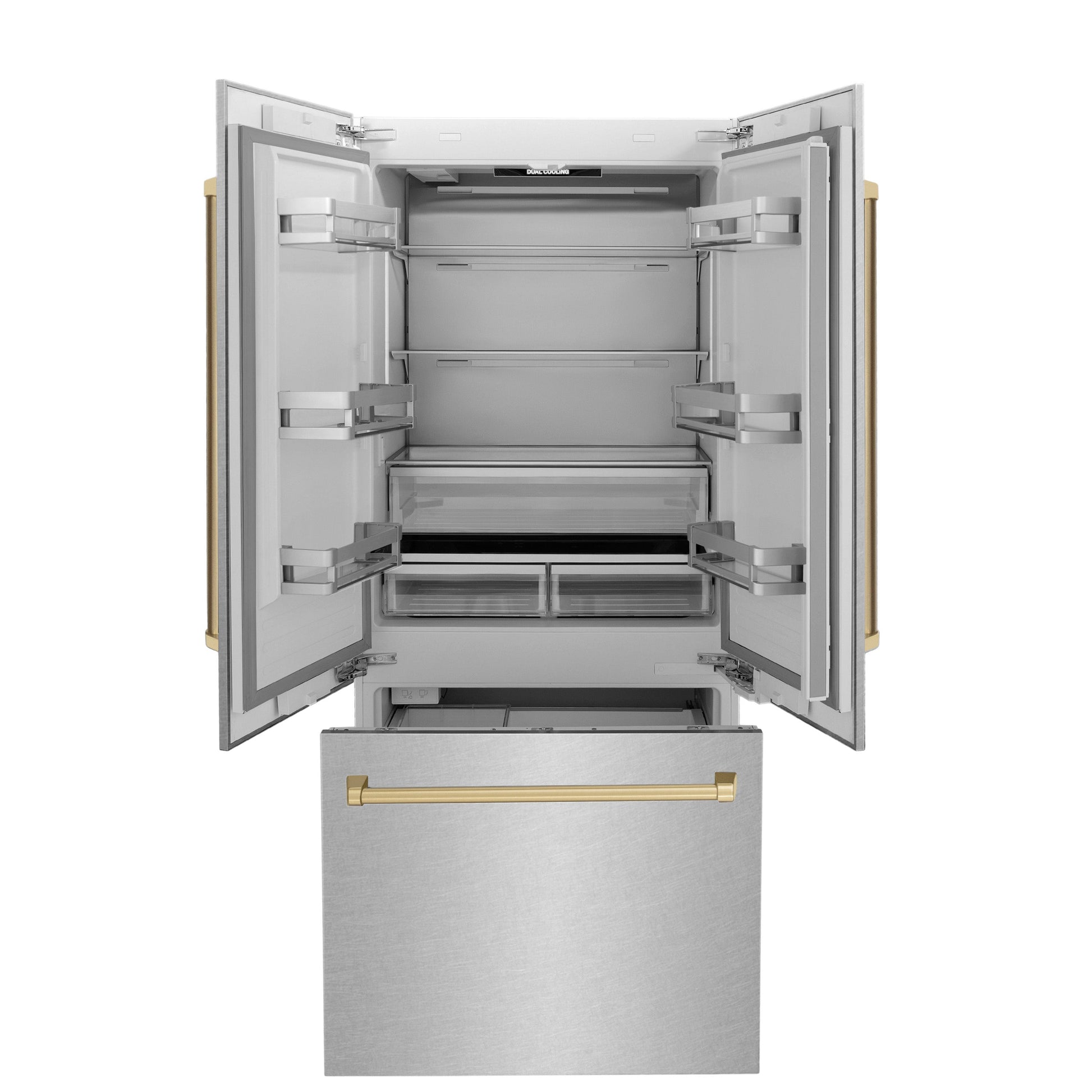Luxury isn’t meant to be left desired—it’s meant to be attainable. The ZLINE Autograph Edition 36 in. 19.6 cu. ft. French Door Built-In Bottom Freezer Refrigerator with Water Dispenser and Ice Maker in Satin Stainless Steel with Champagne Bronze Accents (RBIVZ-SN-36-CB) provides the ultimate upgrade to the center of your home by pairing premium dual cooling technology with enhanced storage capacity for multiple grocery items. Achieve ZLINE Attainable Luxury® excellence with innovative features designed to enhance your kitchen’s cooling and freezing capability.