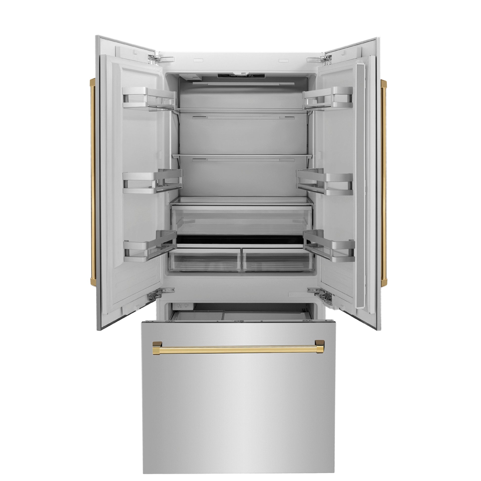 Enhance your kitchen with the ZLINE Autograph 36" 19.6 cu. ft. Built-In 2-Door Bottom Freezer Refrigerator. This refrigerator combines high-quality performance with classic design, offering advanced capabilities such as adjustable temperatures, RapidChill Mode, and a concealed internal water and ice dispenser. Experience ZLINE's Attainable Luxury with this refrigerator, seamlessly blending innovation, elegance, and efficiency.