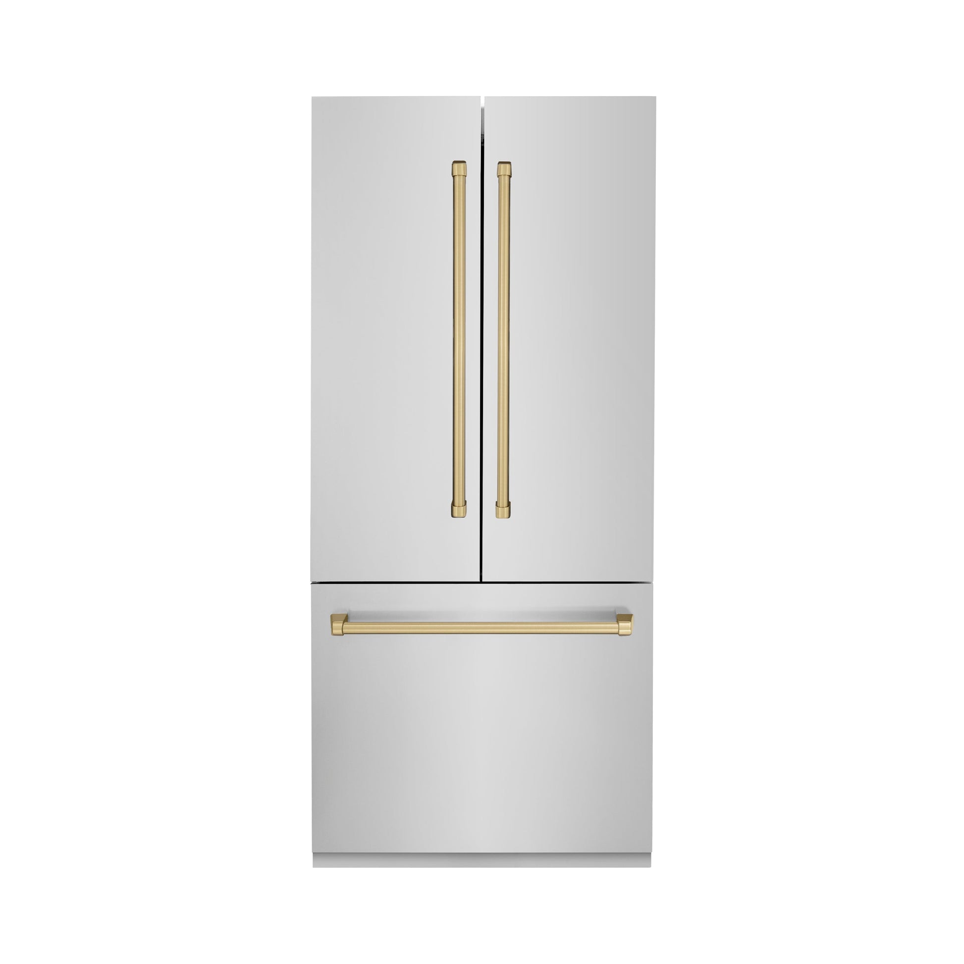 Enhance your kitchen with the ZLINE Autograph 36" 19.6 cu. ft. Built-In 2-Door Bottom Freezer Refrigerator. This refrigerator combines high-quality performance with classic design, offering advanced capabilities such as adjustable temperatures, RapidChill Mode, and a concealed internal water and ice dispenser. Experience ZLINE's Attainable Luxury with this refrigerator, seamlessly blending innovation, elegance, and efficiency.