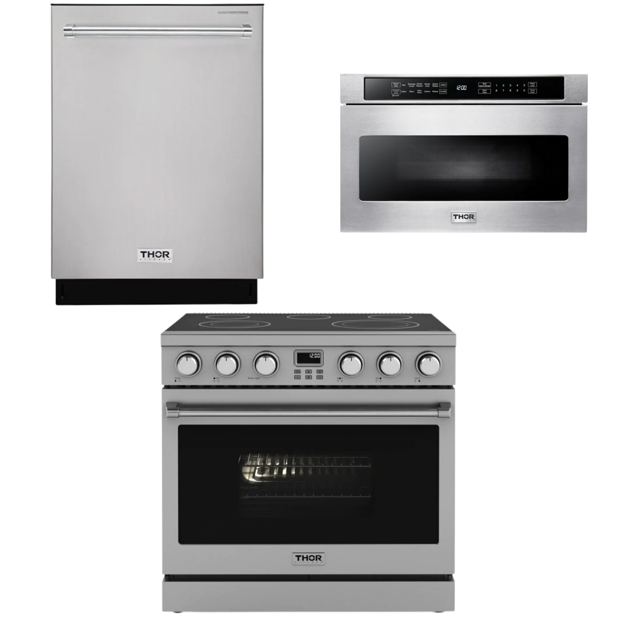 This Thor Kitchen Appliance Package is complete with a 36" Electric Range, 24" Dishwasher and 24" Microwave.