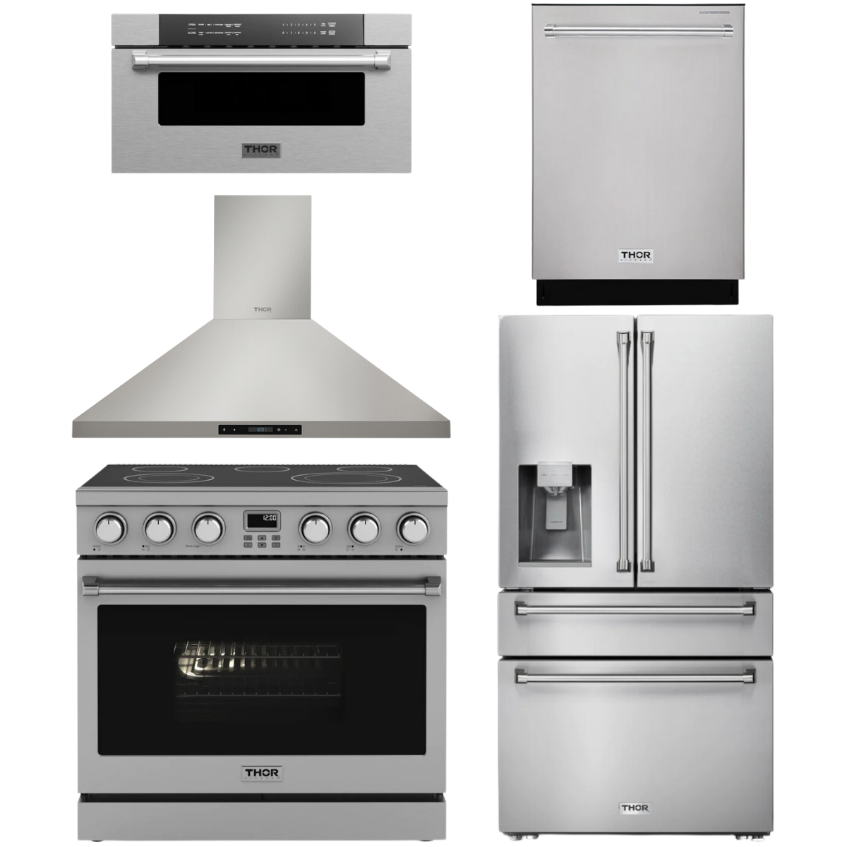 This Thor Kitchen Appliance Package is complete with a 36" Electric Range, 36" Range Hood, 36" Refrigerator, 24" Dishwasher and 30" Microwave.