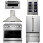 This Thor Kitchen Appliance Package is complete with a 36" Gas Range, 36" Range Hood, 36" Refrigerator, 30" Microwave and 24" Wine Cooler.