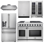 This Thor Kitchen appliance package has a powerful stainless steel 48 inch natural gas range, 48 inch range hood, 36 inch refrigerator with water and ice dispenser, 24 inch dishwasher, and 24 inch wine cooler. This premium and professional appliance bundle is available for your kitchen remodel or build at an affordable price!