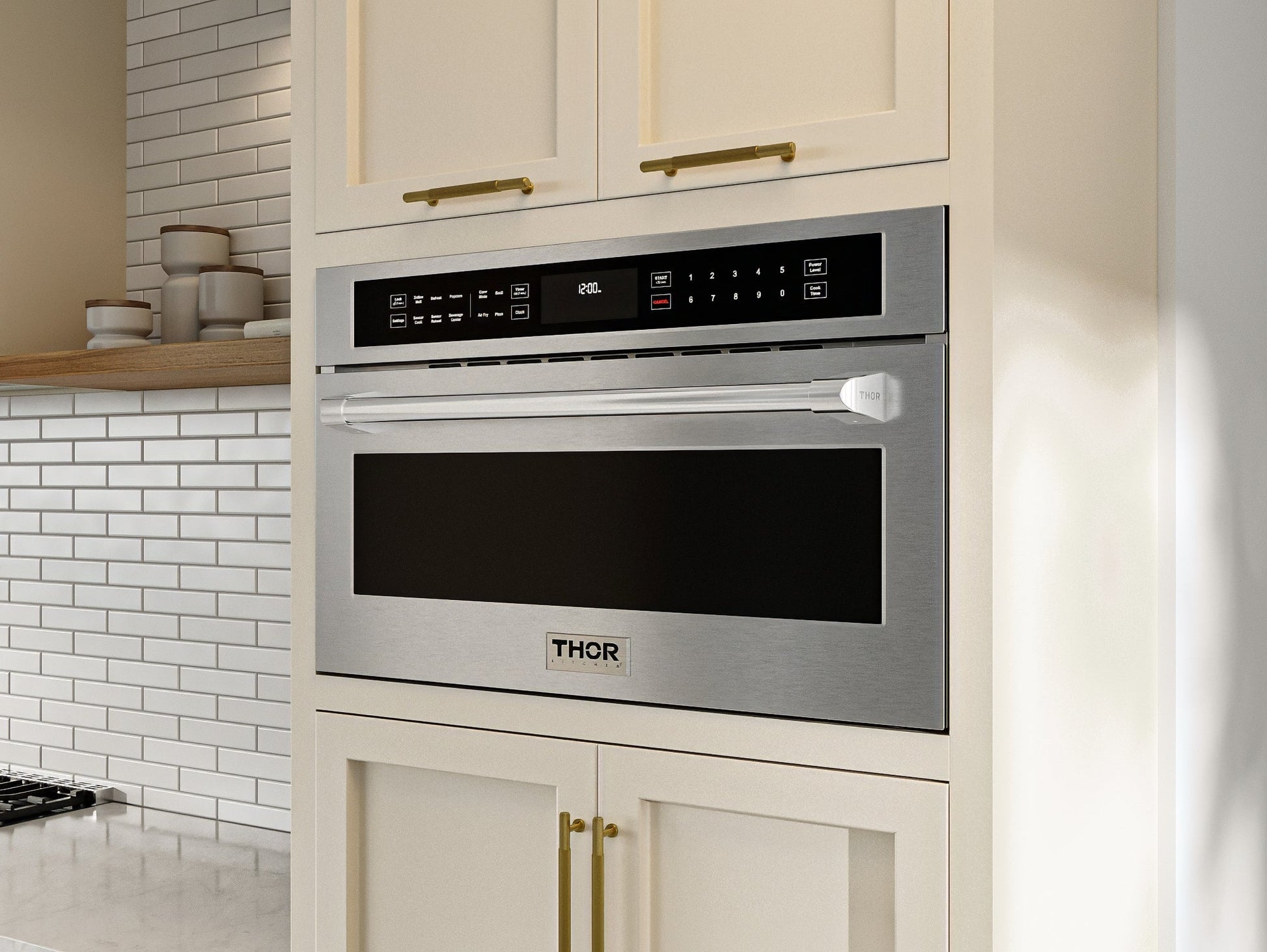 THOR Kitchen delivers professional performance at a practical price with the 30-Inch Built-In Air Fry Microwave Oven (TMO30H). This premium, space-saving appliance combines air frying, broiling, convection baking, and sensor cooking in one modern, sleek unit. With a 1.6 cu. ft. interior and user-friendly touch LCD display, it’s built to handle everyday meals with precision and ease. Added features like Sabbath Mode, a control panel lock, and True Convection ensure smart functionality and peace of mind for any home cook.