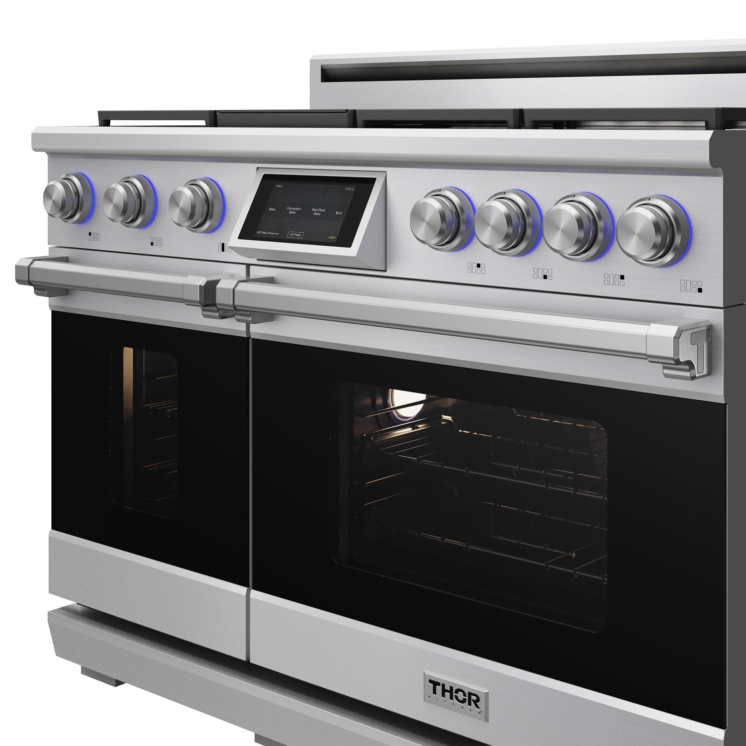 This pro-style range pairs a spacious double oven with powerful Italian brass burners for fast searing, steady simmering, and flexible meal prep. A tilt panel touch control, soft-close door, and LuxGlide™ telescopic racks make access smooth and safe, while built-in casters, leveling legs, and safety-focused re-ignition keep everyday use simple and confident.