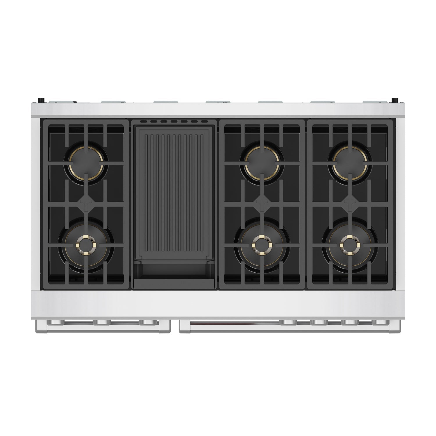 • Continuous Cast-Iron Grates: Heavy-duty, seamless surface supports easy pan movement and pro-grade durability.