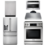 This premium Thor Kitchen appliance package is complete with a Professional 30" Electric Range, 30" Under Cabinet Range Hood, 36" Refrigerator with Water and Ice Dispenser, 24" Dishwasher and 24" Microwave drawer.
