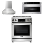This premium Thor Kitchen appliance package is complete with a Professional 30" Propane Gas Range, 30" Wall Mount Range Hood, and 24" Microwave Drawer.