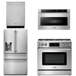 This Thor Kitchen appliance package is complete with a Professional 36" Gas Range, 36" Refrigerator with Water and Ice dispenser, 24" Dishwasher and 24" Microwave Drawer.