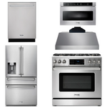 This premium Thor Kitchen appliance package is complete with a Professional 36" Gas Range, 36" Under Cabinet Range Hood, 36" Refrigerator with Water and Ice Dispenser, 24" Dishwasher and 24" Microwave drawer.