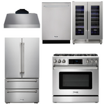 This premium Thor Kitchen appliance package is complete with a Professional 36" Gas Range, 36" Under Cabinet Range Hood, 24" Dishwasher and 36" French Door Refrigerator, and 24" Wine Cooler.