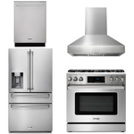 This premium Thor Kitchen appliance package is complete with a Professional 36" Propane Gas Range, 36" Wall Mount Range Hood, 24" Dishwasher and 36" French Door Refrigerator with Water and Ice Maker In-Door.
