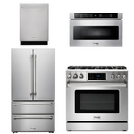 This Thor Kitchen appliance package is complete with a Professional 36" Gas Range, 36" Refrigerator, 24" Dishwasher and 24" Microwave Drawer.
