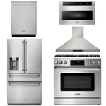 This Thor Kitchen appliance package is complete with a Professional 36" Gas Range, 36"Range Hood, 36" Refrigerator with Water and Ice dispenser, 24" Dishwasher and 24" Microwave Drawer.