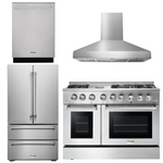 This premium Thor Kitchen appliance package is complete with a Professional 48" Dual Fuel Range, powerful 48" Range Hood, Counter-Depth Refrigerator with Icemaker, and a quiet but powerful 24 inch dishwasher.