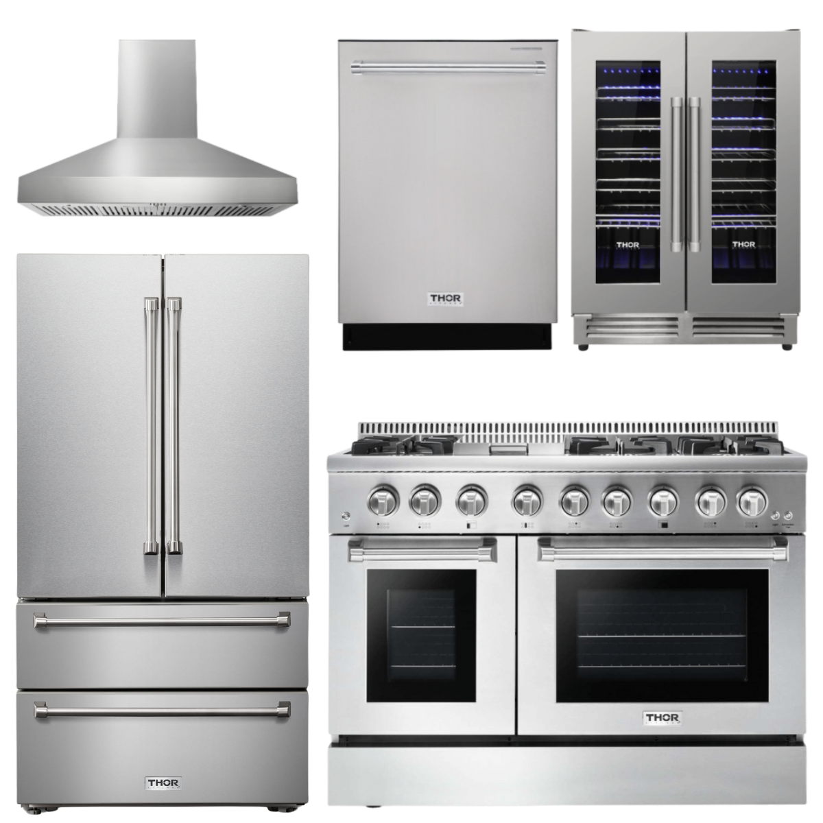 This Thor Kitchen appliance package is complete with a Professional 48" Dual Fuel Range, Wall Mount Range Hood, Refrigerator with Icemaker, dishwasher and a wine cooler.