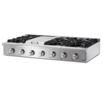 Looking for a professional and stylish range top? This THOR Kitchen 48" Pro Style Gas Range Top, HRT4806U, comes with 6 sealed burners and includes black porcelain drip pan for easy cleanup. It also features a griddle, continuous cast iron grates, automatic re-ignition, and ABS controller knobs. This is the range for you!