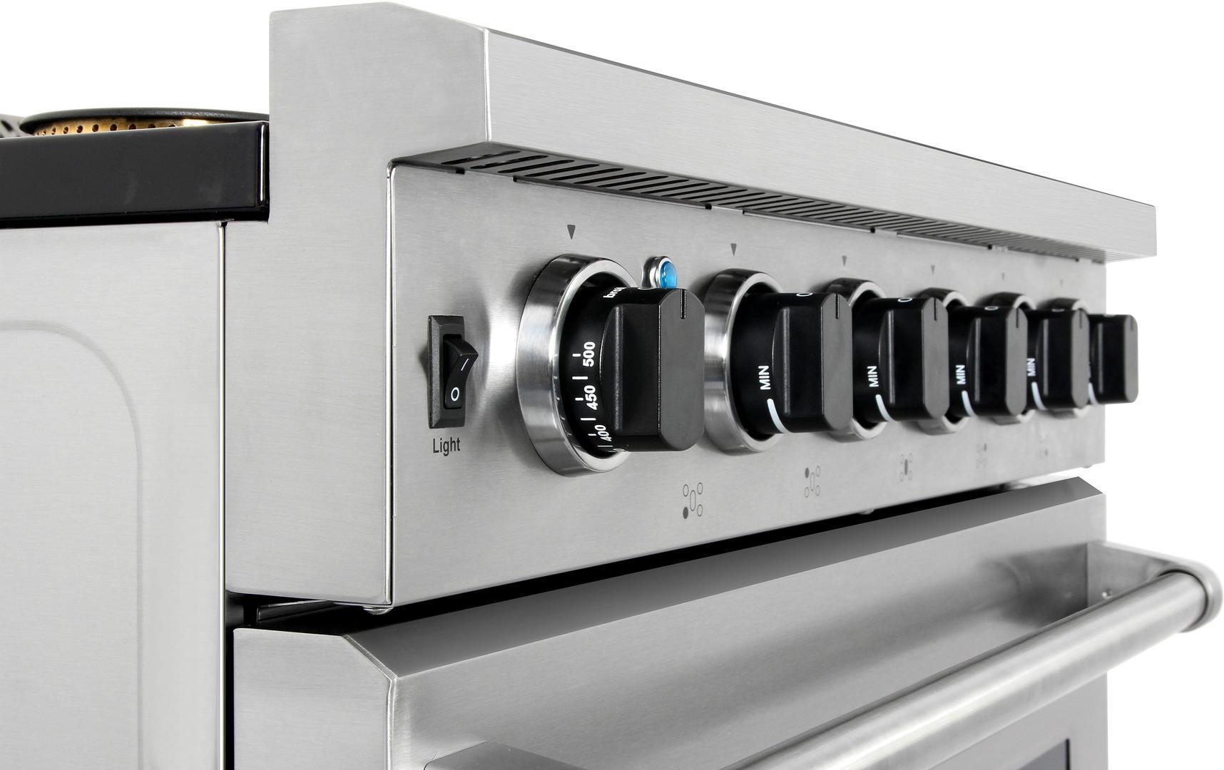 - Pro-Style Knobs. Black burner control knobs add style to the bold range design