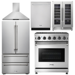 This premium Thor Kitchen appliance package is complete with a Professional 30" Propane Gas Range, 30" Range Wall Mount Hood, 24" Dishwasher, 36" French Door Refrigerator, and 24" Wine Cooler.
