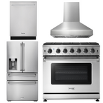 This Thor Kitchen appliance package has a powerful stainless steel 36 inch natural gas range, 36 inch range hood, 36 inch refrigerator with water and ice dispenser, 24 inch dishwasher.