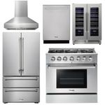 This Thor Kitchen appliance package has a powerful stainless steel 36 inch propane gas range, 36 inch range hood, 36 inch refrigerator, 24 inch dishwasher, and 24 inch wine cooler.
