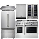 This premium Thor Kitchen appliance package is complete with a Professional 48" Propane Gas Range, 48" Under Cabinet Range Hood, 36" Counter-Depth Refrigerator with Icemaker, a quiet but powerful 24 inch dishwasher and a dual zone 24 Inch Wine Cooler.