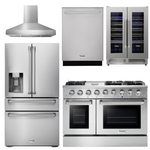 This premium Thor Kitchen appliance package is complete with a Professional 48" Propane Gas Range, 48" Wall Mount Range Hood, 36" Counter-Depth Refrigerator with Water and Ice Dispenser, a quiet but powerful 24 inch dishwasher and a dual zone 24 Inch Wine Cooler.