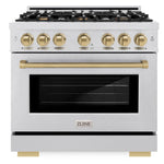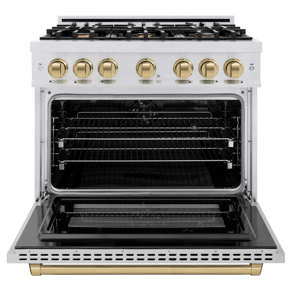 Luxury isn’t meant to be left desired—it’s meant to be attainable. The ZLINE Autograph Edition 36 in. 5.2 cu. ft. Select Dual Fuel Range with 6 Burner Gas Cooktop and Electric Convection Oven in Satin Stainless Steel with Champagne Bronze Accents (HDRSZ-36-CB) combines the elegance of a hand-finished porcelain gas cooktop with 6 Italian-made auto-reignition burners, an electric convection oven with an energy-efficient cooling fan to ensure quiet operation, a Horizon oven door window design, and stunning champagne bronze knobs and handle allowing you to master every meal. With a modern, timeless style and refined functionality, ZLINE Select Dual Fuel Ranges are masterfully crafted to deliver an elevated culinary experience.