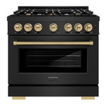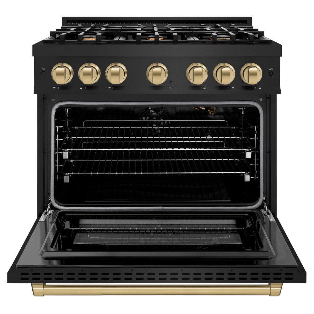 Luxury isn't meant to be desired - it's meant to be attainable. The ZLINE Autograph Edition 36 in. 5.2 cu. ft. Select Gas Range with 6 Burner Cooktop and Convection Gas Oven in Black Stainless Steel and Champagne Bronze Accents (HGRBZ-36-CB) combines the elegance of a hand-finished porcelain gas cooktop with 6 Italian-made auto-reignition burners, a gas convection oven with an energy-efficient cooling fan to ensure quiet operation, a Horizon oven door window design, and stunning champagne bronze knobs and handle allowing you to master every meal. With a modern, timeless style and refined functionality, ZLINE Select Gas Ranges are masterfully crafted to deliver an elevated culinary experience.