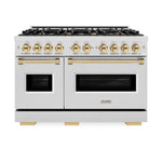 Luxury isn’t meant to be left desired—it’s meant to be attainable. The ZLINE Autograph Edition 48 in. 6.7 cu. ft. Classic Double Oven Dual Fuel Range with 8 Burner Gas Cooktop in Satin Stainless Steel and Polished Gold Accents (CDRSZ-48-G) combines the elegance of a hand-finished porcelain gas cooktop with 8 Italian-made auto-reignition burners, a large electric convection oven with an energy-efficient cooling fan to ensure quiet operation, a small bake-and-broil oven, Landscape oven door window designs, and stunning polished gold knobs and handles allowing you to master every meal. With a modern, timeless style and refined functionality, ZLINE Classic Dual Fuel Ranges are masterfully crafted to deliver an elevated culinary experience.