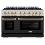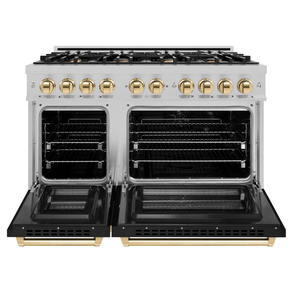Luxury isn’t meant to be left desired—it’s meant to be attainable. The ZLINE Autograph Edition 48 in. 6.7 cu. ft. Select Double Oven Dual Fuel Range with 8 Burner Gas Cooktop in Satin Stainless Steel with Black Matte Doors and Polished Gold Accents (HDRSZ-BLM-48-G) combines the elegance of a hand-finished porcelain gas cooktop with 8 Italian-made auto-reignition burners, a large electric convection oven with an energy-efficient cooling fan to ensure quiet operation, a small bake-and-broil oven, beautiful black matte doors with Horizon window designs, and stunning polished gold knobs and handles allowing you to master every meal. With a modern, timeless style and refined functionality, ZLINE Select Dual Fuel Ranges are masterfully crafted to deliver an elevated culinary experience.