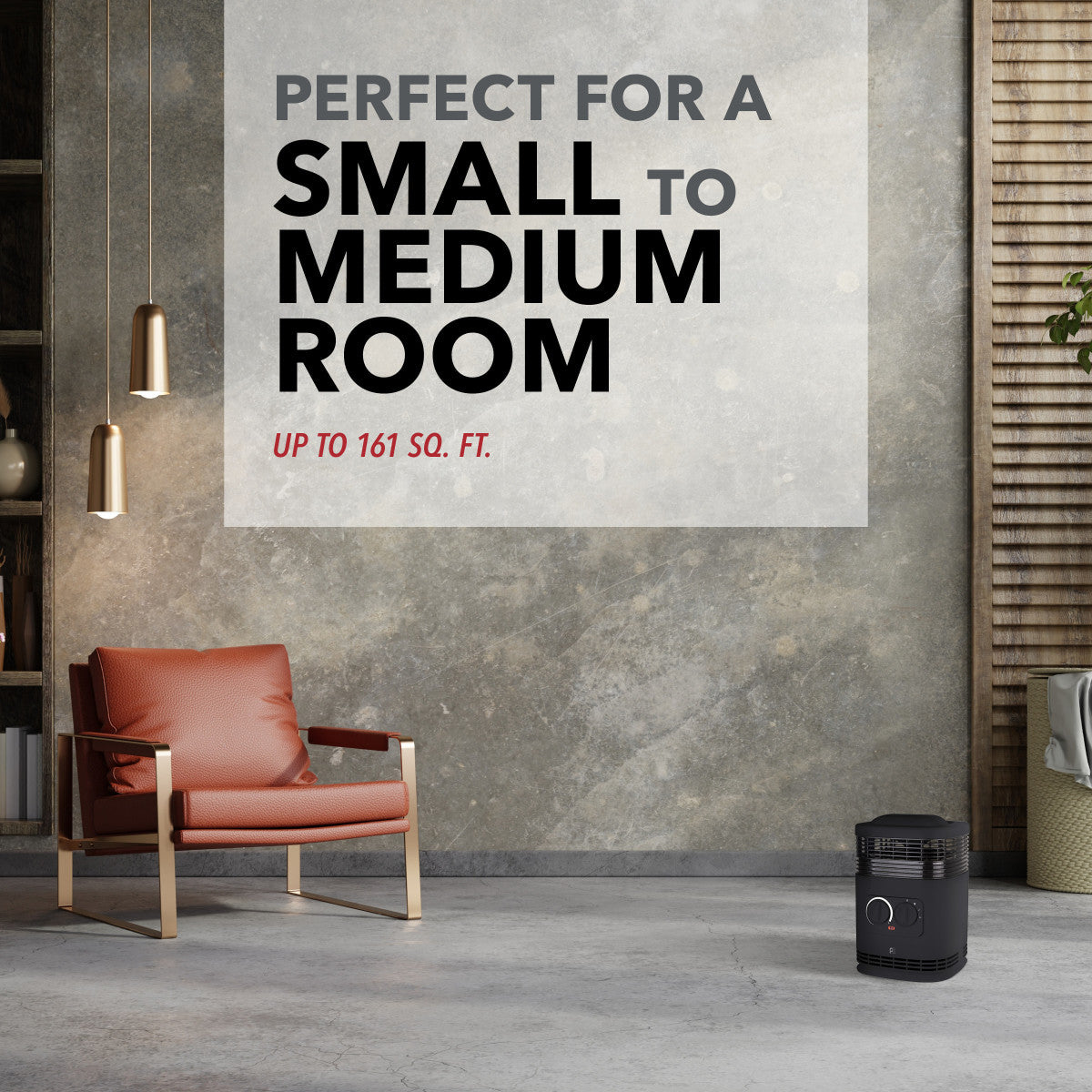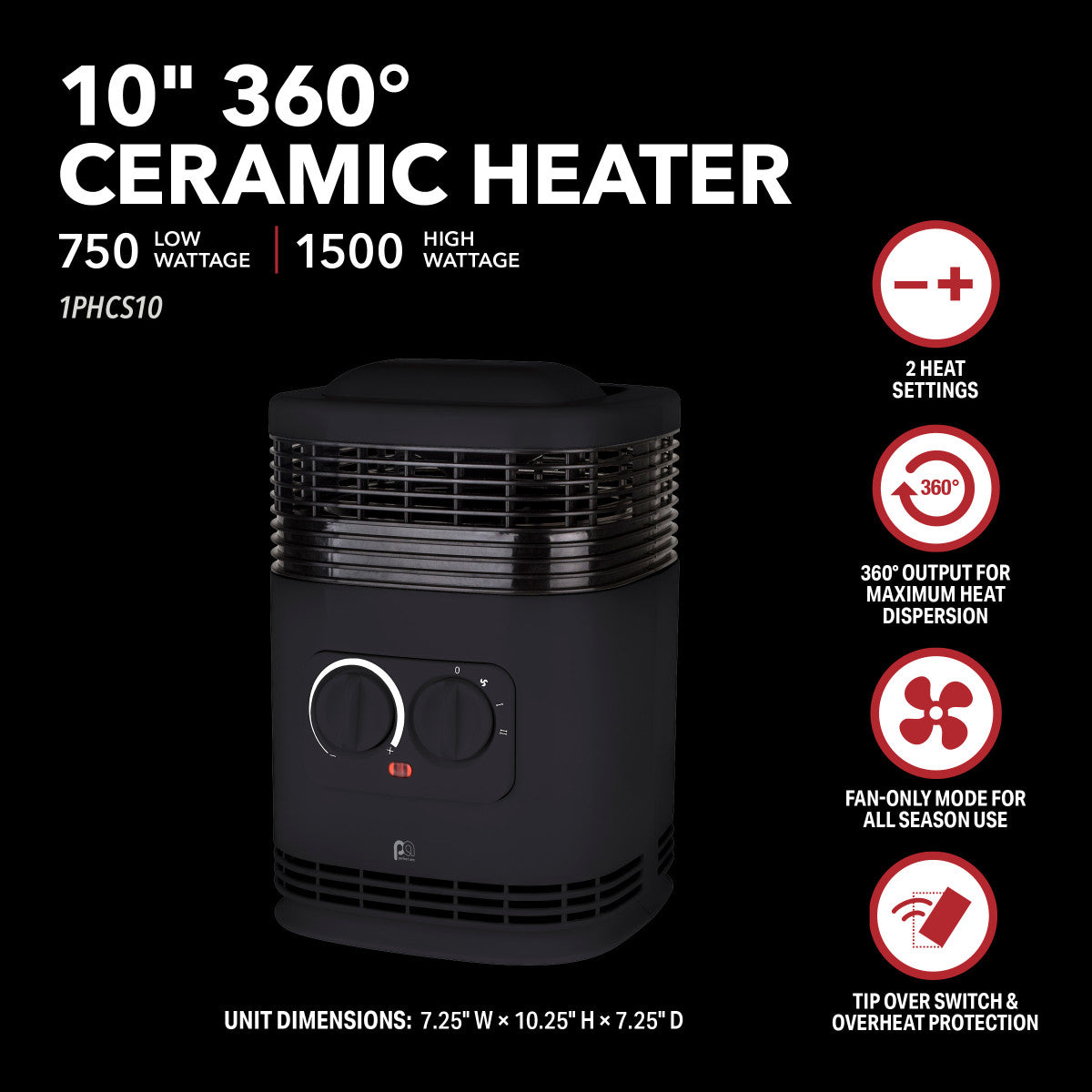 The attractive, compact Perfect Aire 10" 1500/750W 360 degree ceramic heater is an ideal and safe heating solution for smaller-medium size rooms up to 161 square feet. The 360° output on this heater ensures maximum heat dispersion in your room, making it perfect for those cold winter nights. The fan-only mode means you can use it all year round, and the adjustable thermostat lets you control the temperature to your liking. The easy-to-use mechanical controls and cool-touch handle make it a breeze to operate, and the 72” power cord gives you plenty of reach. Plus, it operates quietly so you can enjoy a peaceful night’s sleep. It also features tip-over and overheat protection for your safety. Choose between high and low heat settings (1500/750 watts) to get just the right amount of warmth.