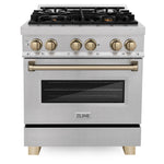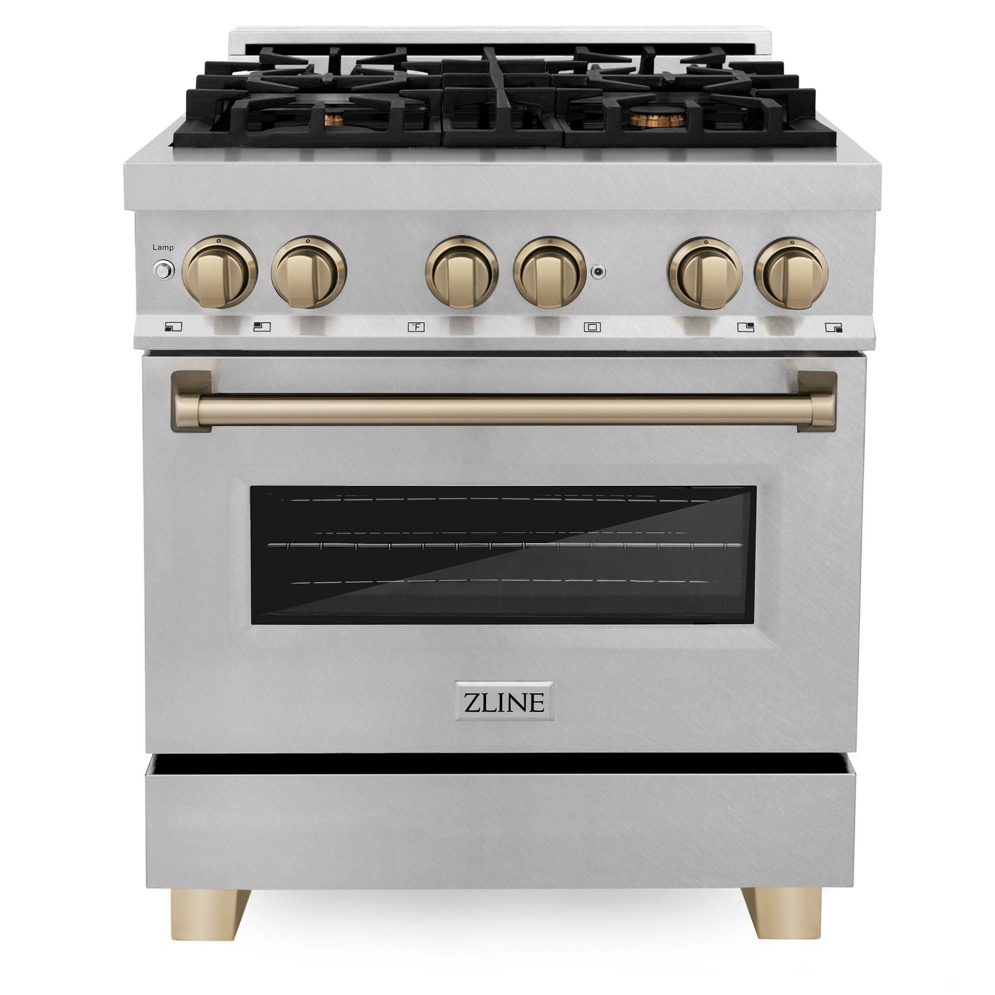 Luxury isn’t meant to be left desired—it’s meant to be attainable. The ZLINE Autograph Edition 30 in. 4.0 cu. ft. Legacy Dual Fuel Range with 4 Burner Gas Cooktop and Electric Convection Oven in Satin Stainless Steel and Champagne Bronze Accents (RASZ-SN-30-CB) pairs a powerful gas cooktop with 4 Italian-crafted burners, an electric convection oven with a Landscape oven door window design, and elegant champagne bronze knobs and handle. With innovative features designed to enhance your kitchen’s capability, ZLINE Legacy Dual Fuel Ranges provide a professional culinary experience by pairing unmatched performance with timeless style.